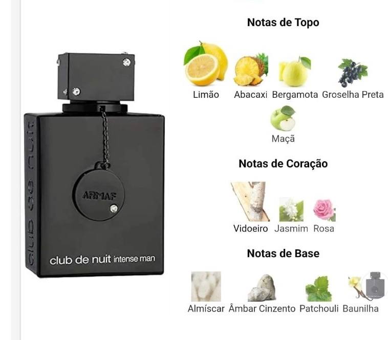 Club de Nuit Intense Man de Armaf é um perfume Amadeirado Especiado Masculino. As notas de topo são: Limão, Abacaxi, Bergamota, Groselha Preta e Maçã. As notas de coração são: Vidoeiro, Jasmim e Rosa. As notas de fundo são: Almíscar, Âmbar Cinzento, Patchouli e Baunilha.