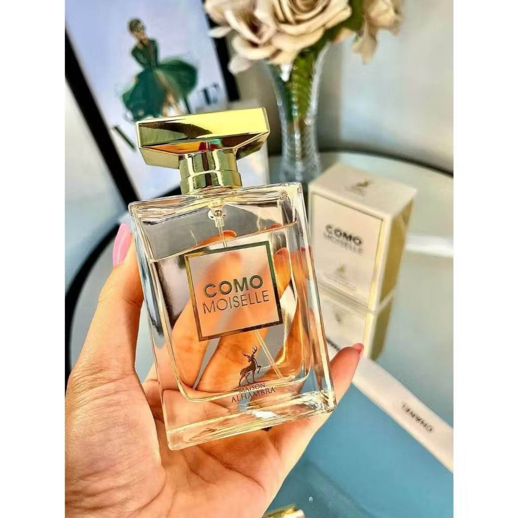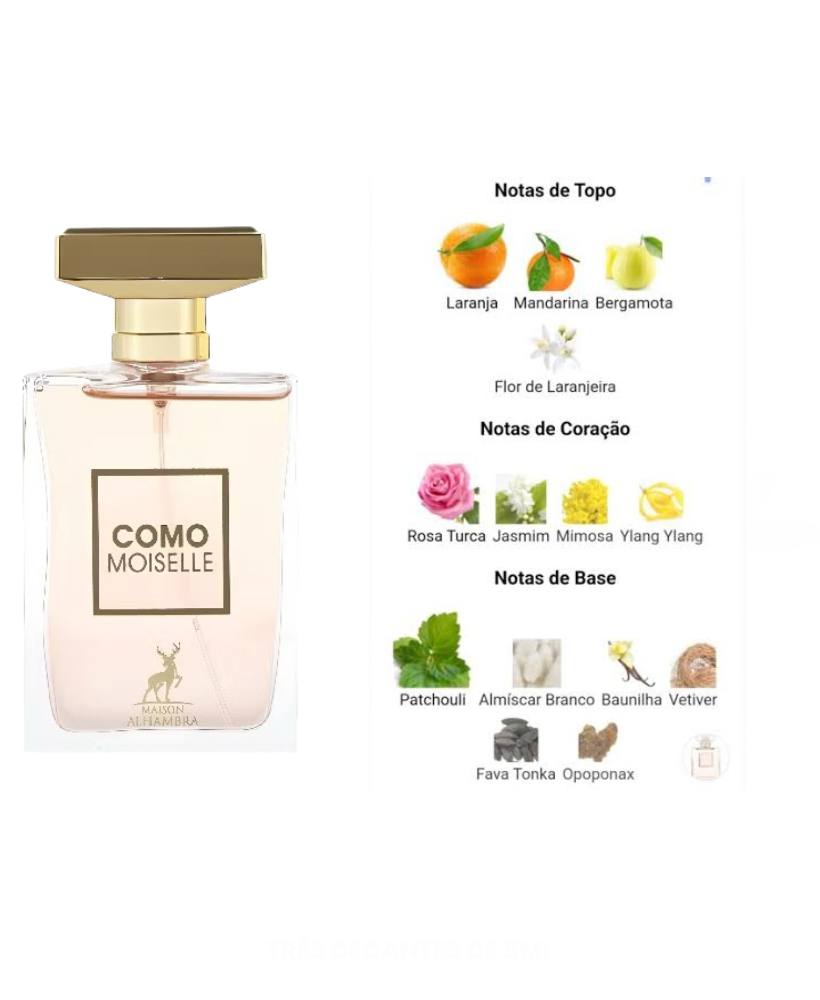 Decante 100% original de Como Moiselle - Maison Alhambra, retirado diretamente de frasco lacrado e enviado em frasco de vidro com borrifador e vedação segura.