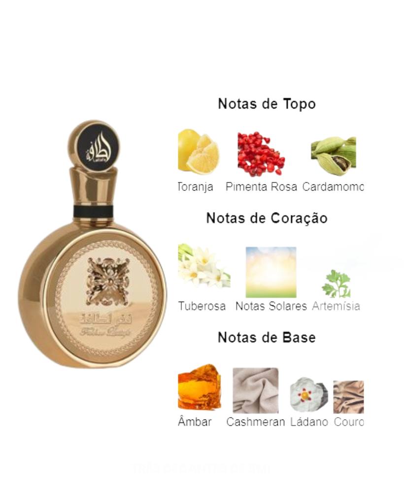 Fakhar Extrait de Lattafa Perfumes é um perfume Compartilhável. As notas de topo são: Toranja, Cardamomo e Pimenta Rosa. As notas de coração são: Tuberosa, Notas Solares e Artemísia. As notas de fundo são: Âmbar, Cashmeran, Ládano e Couro.
