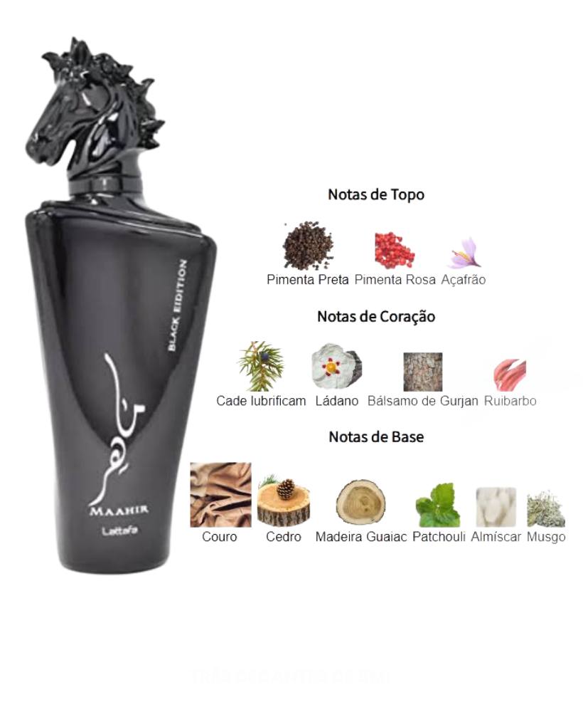 Maahir Black Edition de Lattafa Perfumes é um perfume Âmbar Especiado Compartilhável. Maahir Black Edition foi lançada em 2019. As notas de topo são: Pimenta Preta, Pimenta Rosa e Açafrão. As notas de coração são: Ládano, Cade lubrificam, Bálsamo de Gurjan e Ruibarbo. As notas de fundo são: Couro, Cedro, Patchouli, Madeira Guaiac, Almíscar e Musgo.