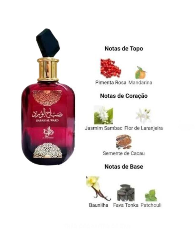 Sabah Al Ward de Al Wataniah é um perfume Âmbar Floral Feminino. As notas de topo são: Pimenta Rosa e Mandarina. As notas de coração são: Semente de Cacau, Flor de Laranjeira e Jasmim Sambac. As notas de fundo são: Baunilha, Fava Tonka e Patchouli.