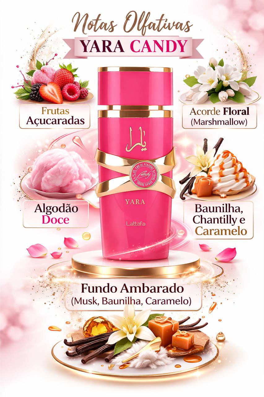 O Yara Candy é a definição de feminilidade moderna com um toque gourmand delicioso. Uma fragrância que mistura doçura, cremosidade e sensualidade na medida certa — perfeita para quem quer marcar presença sem esforço.